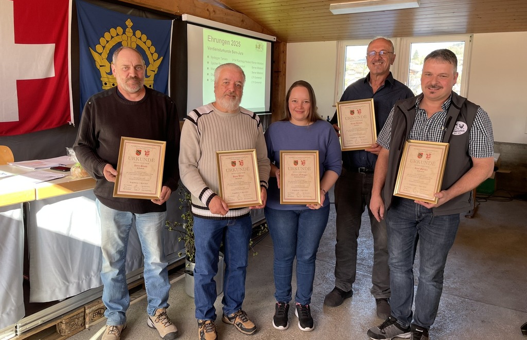 Im Rahmen der Ehrungen wurden Tamara Nydegger, René Spicher und Hans Weber aus dem Landesteil Berner Mittelland sowie Ernst Dubach und Peter Stucki aus dem Landesteil Emmental mit der Verdiensturkunde ausgezeichnet. Ihre langjährige Arbeit und ihr Engagement für den Verband wurden mit dieser Ehrung gewürdigt.